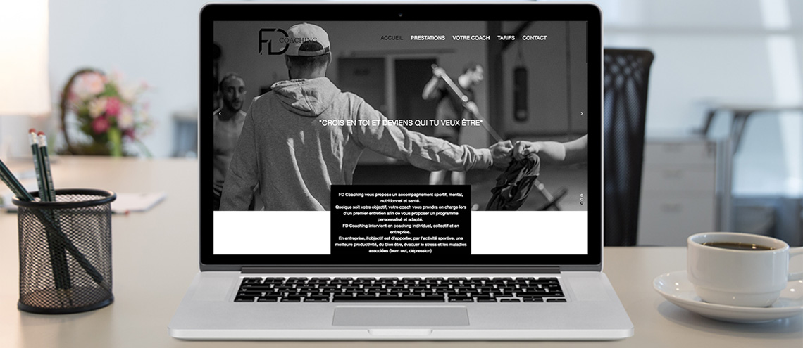 J'ai alors réalisé son logo avec ses initiales comme voulu, sa carte de visite, ainsi que son site internet responsif avec pour objectif de respecter une charte colorimétrique "black & white". Merci à FDCoaching pour sa confiance.